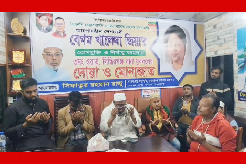 বিএনপির চেয়ারপারসন ও সাবেক প্রধানমন্ত্রী বেগম খালেদা জিয়ার রোগমুক্তি কামনায় সিদ্ধিরগঞ্জ থানাধীন ৩নং ওয়ার্ড যুবদলের উদ্যোগে দোয়া ও মিলাদ মাহফিল অনুষ্ঠিত হয়েছে।
